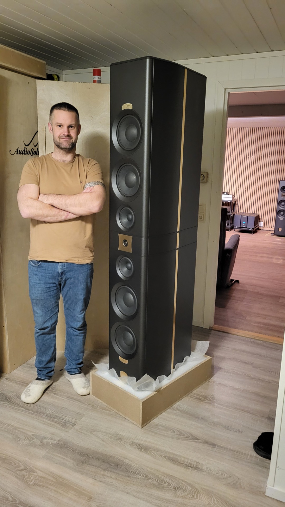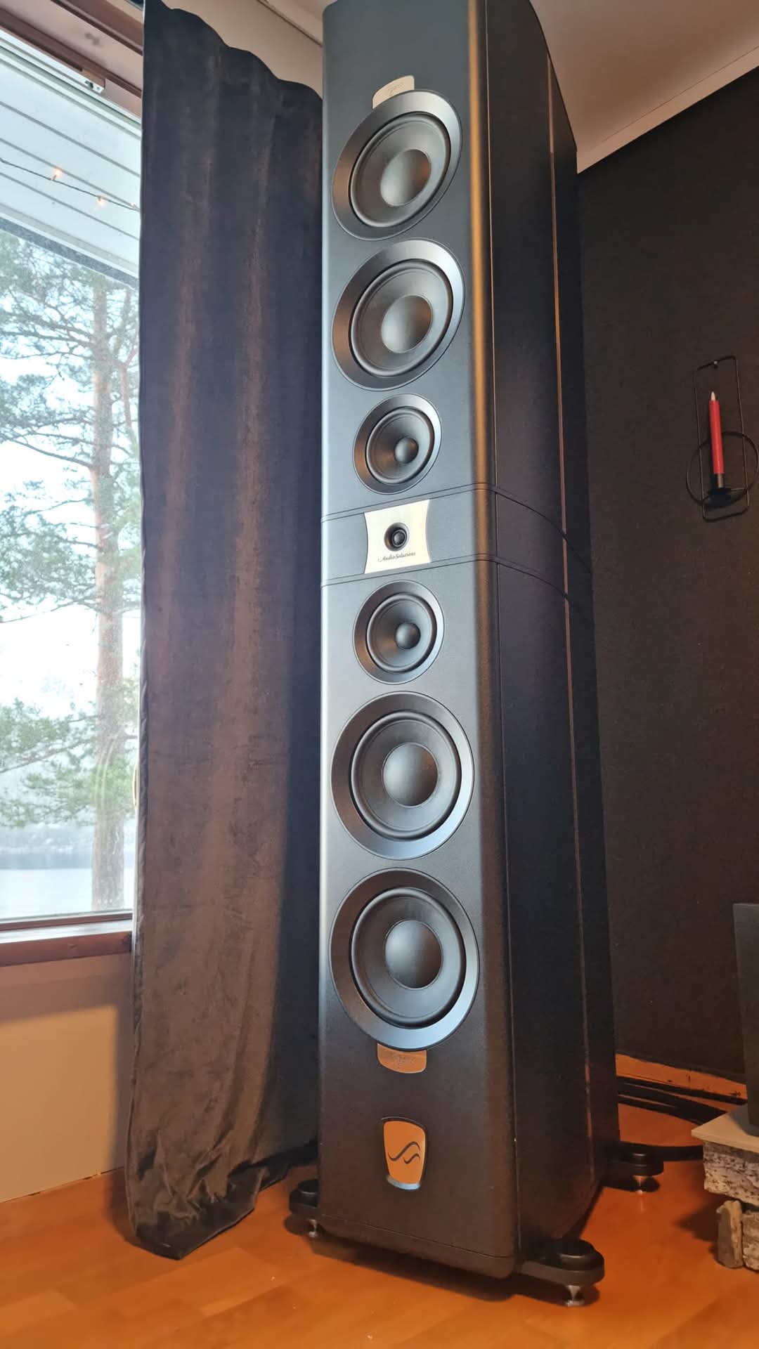 AudioSolutions Figaro XL2. (Brukte/innbytte) Dette er den største høyttaleren fra AudioSolutions. Med disse får du ett lydtrykk som gjør sub unødvendig. Samtidlig så spiller de krystallklart og detaljerte uten og gi lyttertretthet. Selv om de er store så har vi ikke hatt problemer med og få de til og spille fantastisk i selv små rom. Pluss at de ser fantastiske ut. Den ene høøyttaleren har ett par merker på hjørnet på baksiden ab kabinettet. Derav den lave prisen. Gjenstår fortsatt nesten 3år av garantien. Trenger heller ikke en monster forsterker. Gi de en forsterker av god kvalitet med solid strømforsyning så er du i boks. Ord pris 360,000kr. Selges for kun 150,000kr.